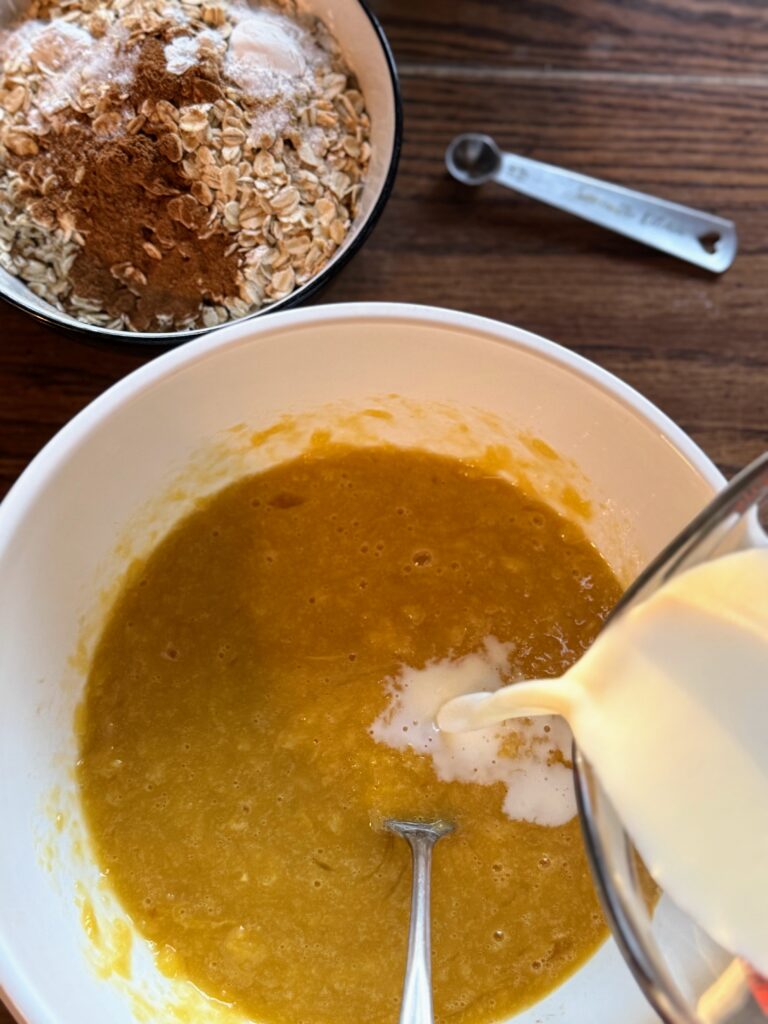 - In a large mixing bowl, combine pumpkin, egg, maple syrup, and vanilla. Whisk well, fully incorporating the pumpkin. Stir in the milk.